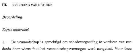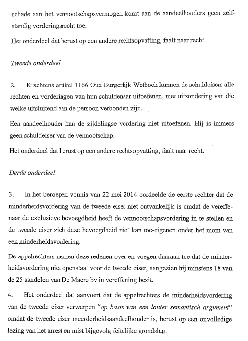 Op de eerste en de tweede vraag antwoordt het Hof, in lijn met daaromtrent de gevestigde opvattingen zijn: respectievelijk “ja: ook tijdens de vereffening kan een aandeelhouder geen afgeleide schade vorderen” en “nee: de aandeelhouder kan als dusdanig niet de zijdelingse vordering instellen. De praktijk en de doctrine zijn het meest verdeeld over de derde en vooral de vierde vraag. Helaas liet het cassatie-middel daar het Hof niet toe een antwoord te geven.