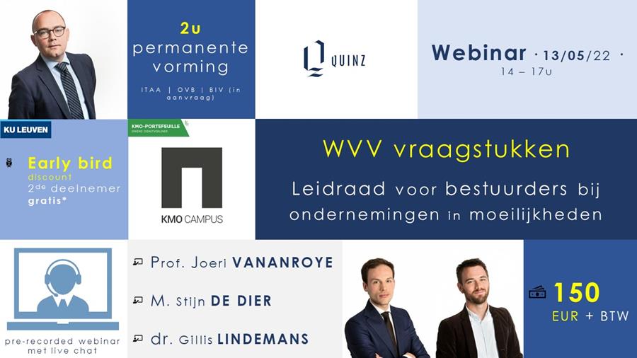Deze blogpost is gebaseerd op een onderdeel van onze bijdrage in Lessen na twee jaar WVV verschenen bij Roularta. Op 13 mei 2021 is er een online seminarie (KMO Campus) over bestuursaansprakelijkheid vanuit het perspectief van een bestuurder van een vennootschap met (dreigende) financiële moeilijkheden.