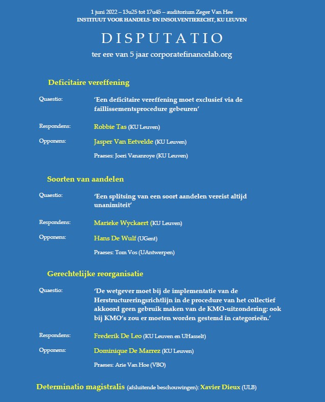 De studiemiddag ter ere van vijf jaar Corporate Finance Lab vindt plaats op woensdag 1 juni 2022 te Leuven van 13u35 tot 17u45. De thema’s die aan bod komen zijn de deficitaire vereffening, soorten van aandelen en de gerechtelijke reorganisatie. De inschrijvingsprijs is 75 EUR en omvat een koffiepauze en receptie. Erkenning bij OVB en IBJ voor 4 punten. Erkenning door IGO in aanvraag. Deelname kan fysiek of via livestream. Inschrijven kan hier.