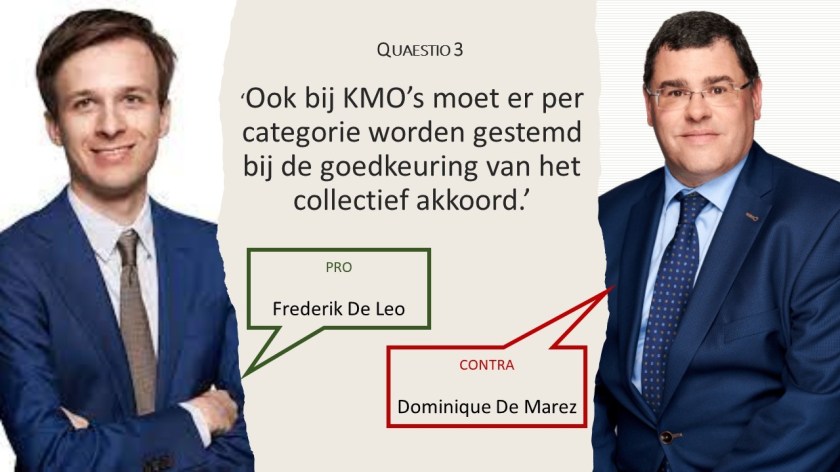 • Nieuwe regels gerechtelijke reorganisatie door collectief akkoord. Het gros van de bepalingen van de Herstructureringsrichtlijn moet tegen 17 juni 2022 worden geïmplementeerd in het Belgische recht. Aangezien er nog geen voorontwerp is (wel een voor-voorontwerp waarvan we begrijpen dat het momenteel politiek wordt besproken binnen de meerderheid), is het een veilige voorspelling dat dit wellicht niet tijdig zal lukken. Een opvallende vernieuwing die de Herstructureringsrichtlijn oplegt (althans minstens voor ondernemingen die geen kmo’s zijn), is het stemmen in categorieën/klassen. Dit doet een aantal vragen rijzen. Waarom wordt er gestemd in categorieën? Hoe moet een categorie worden samengesteld? Moet de Belgische wetgever gebruikmaken van de mogelijkheid om kmo’s uit te sluiten van de verplichting om te stemmen in categorieën? Neen op die laatste vraag, volgens Frederik De Leo (KU Leuven en UHasselt, advocaat), jawel volgens Dominique De Marrez (KU Leuven, advocaat). Aangezien beide opponenten het oor van de wetgever hebben, zal hun discussie ook inzicht geven in wat de plannen zijn van de steller van het ontwerp van Belgische implementatiewet.