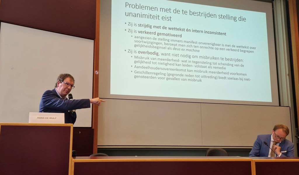 Is de unanimiteitsregel perfect? Zeker niet. Zoals heel wat in dit soortenverhaal, is er veel ruimte voor verbetering. Er is wellicht een risico op strategische blokkering van zinvolle transacties (terzijde: het enthousiasme van De Wulf voor het misbruik van meerderheid als antidotum strekt zich blijkbaar niet uit tot het misbruik van minderheid, nochtans conceptueel equivalent). Naar mijn inschatting is dat risico eerder klein, zeker afgewogen tegen de andere van de weegschaal, maar dat is een feitelijke discussie, nul is het zeker niet. Daarom is de voorzet die Joeri Vananroye tijdens de vragenronde gaf, van een Kevin-De-Bruyne-achtige precisie. Stem gewoon per soort in de toekomstige soorten die je wil creëren. Zorg dat je in elke toekomstige soort 75% haalt. Ik had de indruk dat De Wulf zich daar wel in kon vinden. Zeer goed, maar laten we wel wezen: dat is dan een overwinning voor het andere standpunt. Niet: laat de 75%-aandeelhouder zijn/haar goesting doen met de rechten van de 25%-aandeelhouder (onder voorbehoud van misbruik) zoals de Wulf bepleit. Wel: zorg dat je het akkoord hebt van de minderheidsaandeelhouders wier rechten je wil beknotten, zoals Wyckaert en ikzelf bepleiten.