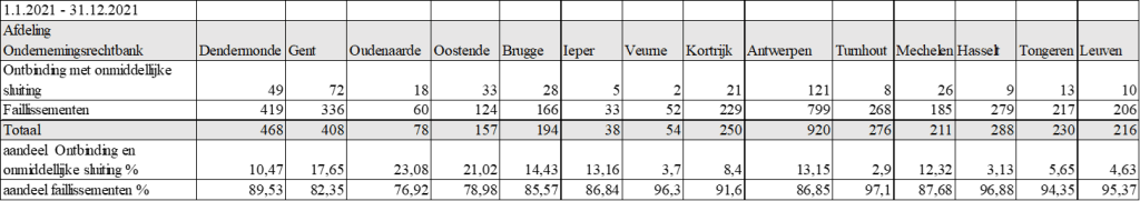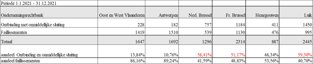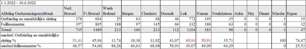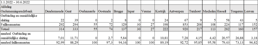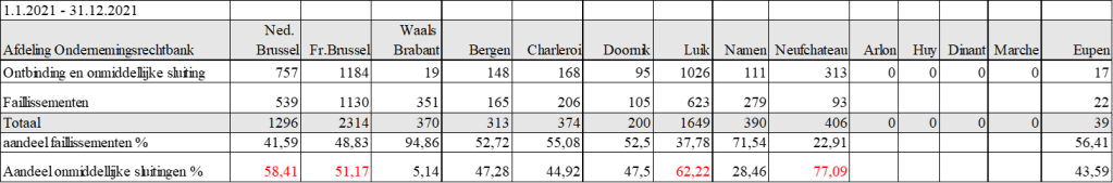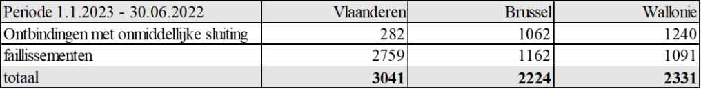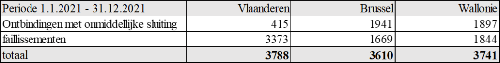 Deze cijfers zijn gebaseerd op de publicaties in het Belgisch Staatsblad en bevatten alle “gerechtelijke ontbindingen met onmiddellijke sluiting” en “faillietverklaringen”, met uitsluiting van beslissingen inzake VZW’s.