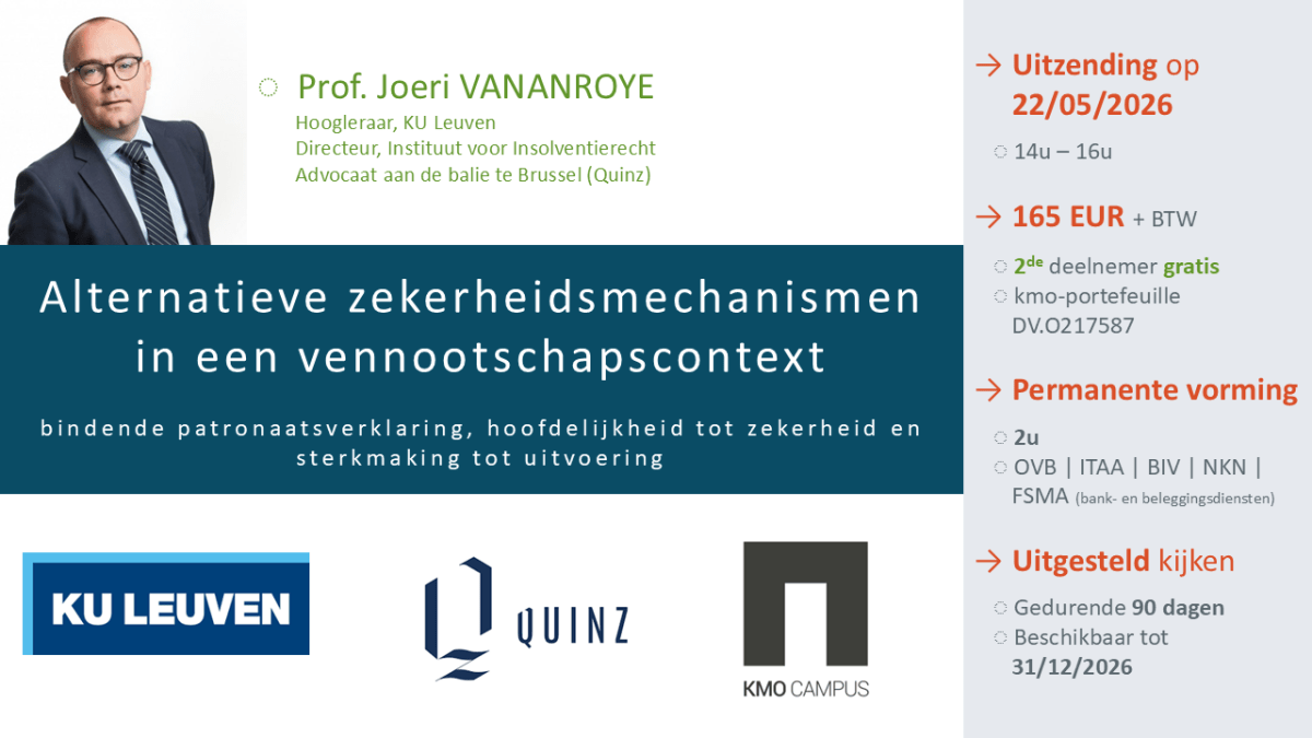Deze post is gebaseerd op mijn bijdrage in Nieuw recht inzake persoonlijke zekerheden, eerder dit jaar uitgegeven bij Intersentia. Ik spreek hierover op het online seminar over Alternatieve zekerheidsmechanismes in een vennootschapscontext van KMO Campus uitgezonden op 22 mei 2026.